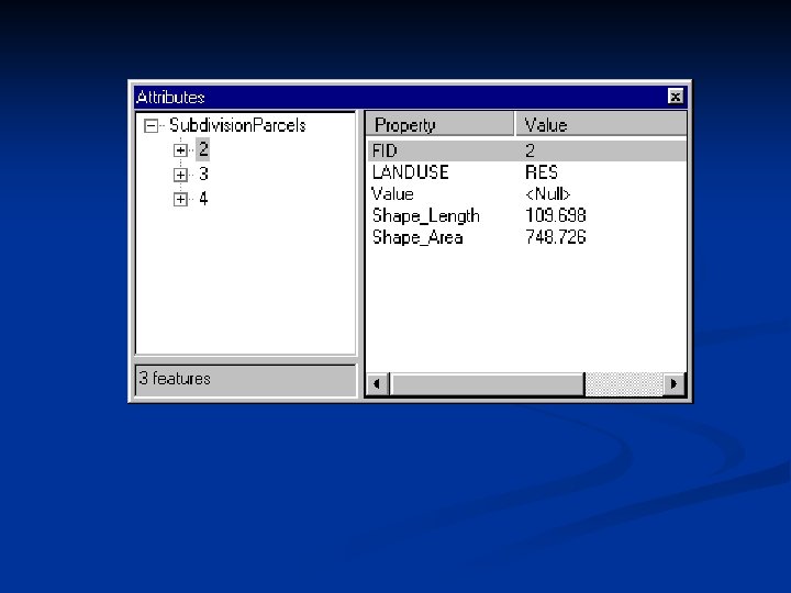 Access and edit attribute data in Arc. Map. n When you want to edit feature attributes, you start an editing session. When you're in an editing session, you can view the attributes of selected features by clicking the Attributes button to bring up the Attributes dialog. The Attributes dialog has two parts: a tree view on the left that lists each selected feature, and a pane on the right that shows the attribute values for the feature currently selected in the tree view.