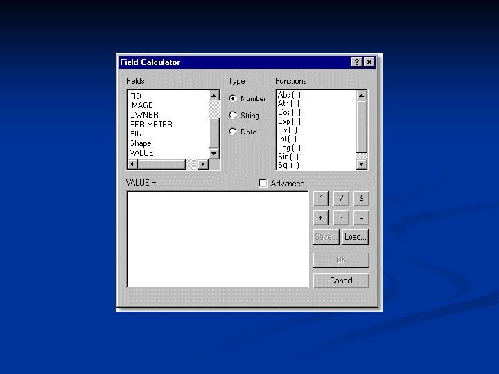 n To create an expression in the Field Calculator, you combine fields, functions, and operators. As you click on fields and functions, they appear in the expression box. You can also type directly into the box. The expression below will update the VALUE field with the results of multiplying each feature's area by 1. 5.