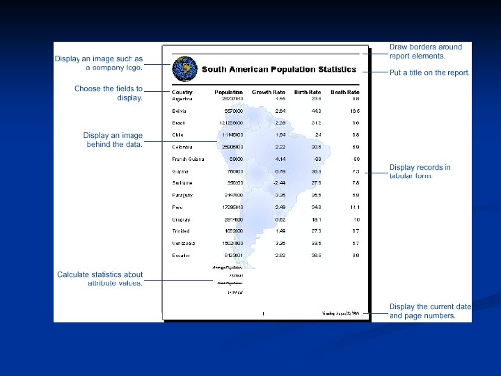 Reports n n A report presents tabular information about map features (from a feature attribute table) formatted in an attractive manner. You can choose which fields from your table you want to display and how you want to display them. Once you've created a report, you can place it on your map layout with your geographic data or save it as a file for distribution. A report includes a title, page numbers and the current date, summary statistics, images, borders, and, of course, the data from the feature attribute table.