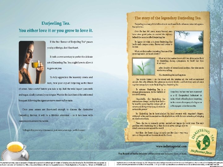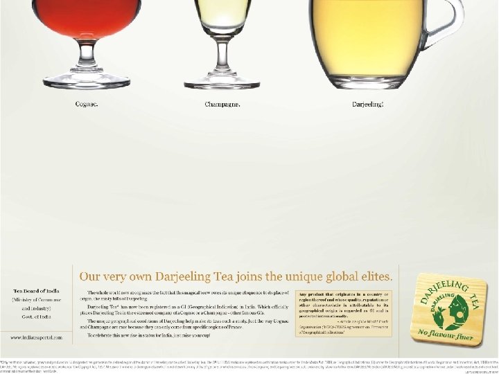 THE DARJEELING TEA STORY LEGAL PROTECTION Ø 2004 for Ø 2004 - India – Copyright registration obtained DARJEELING logo Japan – Collective mark application filed for DARJEELING word Ø 2004 - Australia – Certification mark registrations for DARJEELING word and logo marks granted Ø 2004 - Germany – Collective mark application filed for DARJEELING word