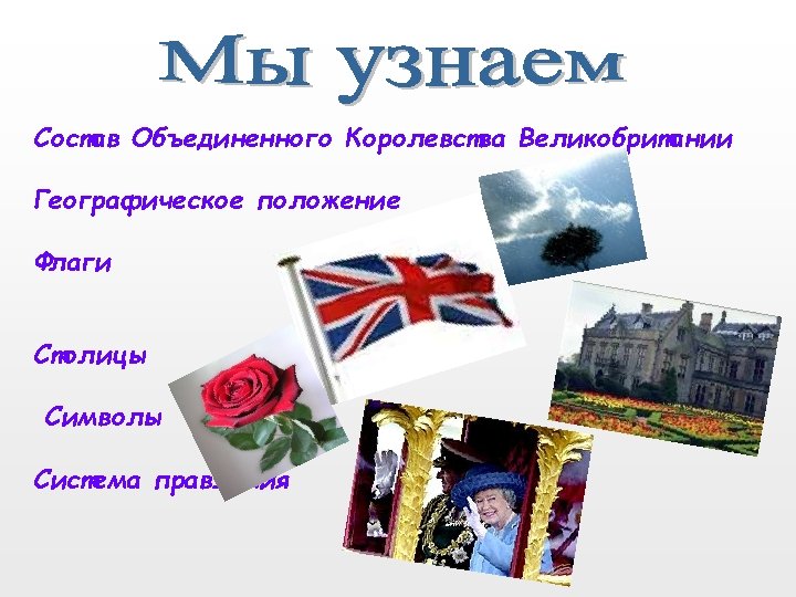THE UK IS A CONSTITUTIONAL MONARCHY. IN LAW, THE HEAD OF STATE IS THE QUEEN. IN PRACTICE, THE QUEEN REIGNS, BUT DOES NOT RULE. THE COUNTRY IS RULED BY THE ELECTED GOVERNMENT WITH THE PRIME MINISTER AT THE HEAD. Buckingham Palace is the London home of the Queen. When the flag is flying on the top she is at home.
