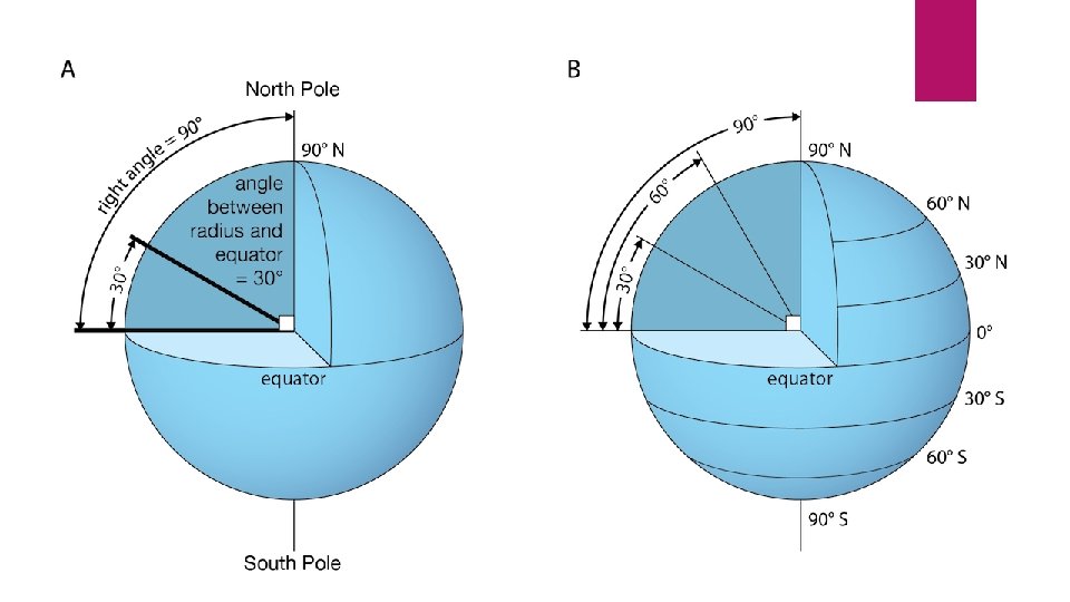 Latitude continued…… Latitude For example: The North Pole is 90°N (north) latitude and the South Pole is 90°S (south) latitude. The Equator measures 0° because it is exactly in the middle of the two poles (North & South) Imagine you could draw a line from the North Pole into the center of Earth and rom the center straight to the surface. The lines would form a 90° angle. That’s why the North Pole has the latitude 90°N and the South Pole has the latitude 90°S A line from the center of Earth to Washington, D. C. , would form an angle of about 38°, which is why the latitude of Washington, D. C. , is 38°