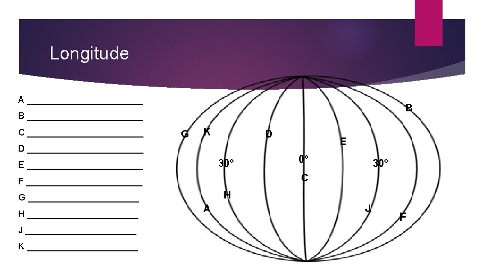 Longitude Lines of longitude—run from the North Pole to the South Pole Also known as meridians Divide the globe into units called degrees Prime Meridian (also called the Meridian of Greenwich) Measures 0° longitude Runs through Greenwich, England Circles the middle of the Earth Runs through both the North Pole and the South Pole When finding longitude, E or W will follow the longitude coordinate Because anything East of the Prime Meridian is in the Eastern Hemisphere Anything West of the Prime Meridian is in the Western Hemisphere