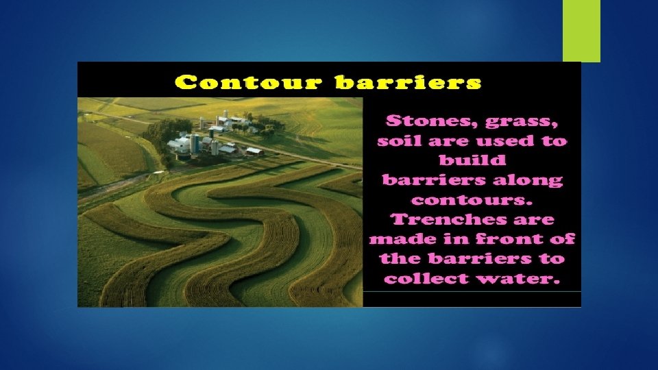 v Contour ploughing: Ploughing parallel to the contours of a hill slope to form a natural barrier for water to flow down the slope.