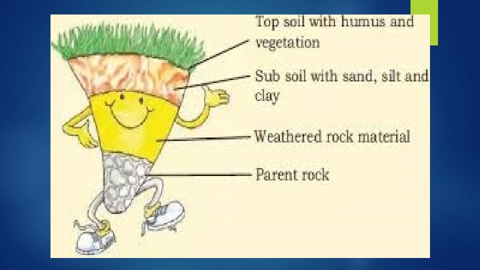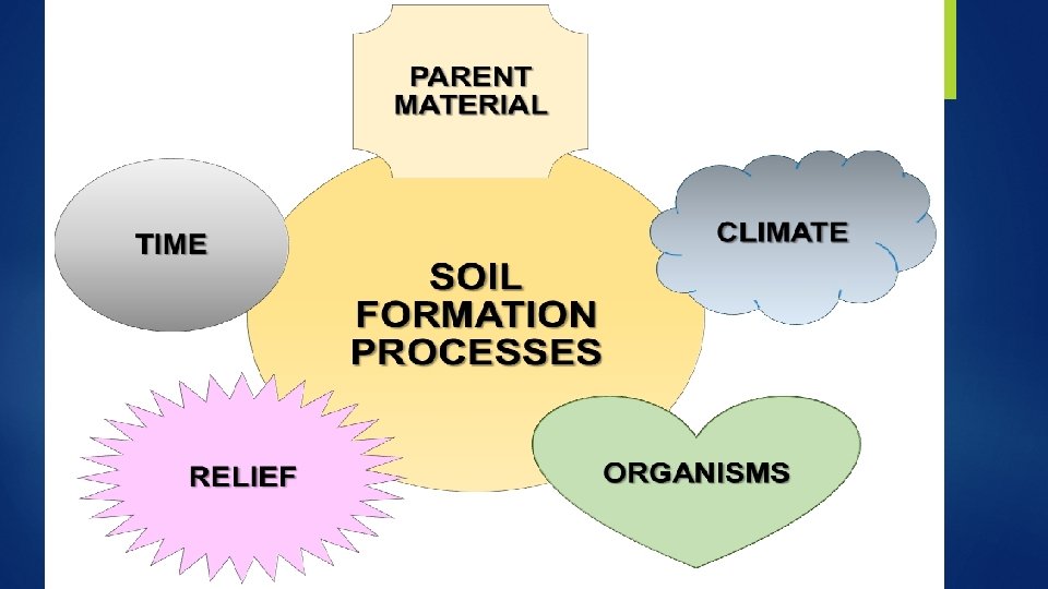 The soil formation depends up on 5 factors. v parent rock: means the rock from which the soil is formed it decides colour, texture , chemical property , mineral, permeability. v Relief: relief means topography height of land; slope determine accumulation of soil. v Flora , fauna and micro organism affect the rate of humus formation.