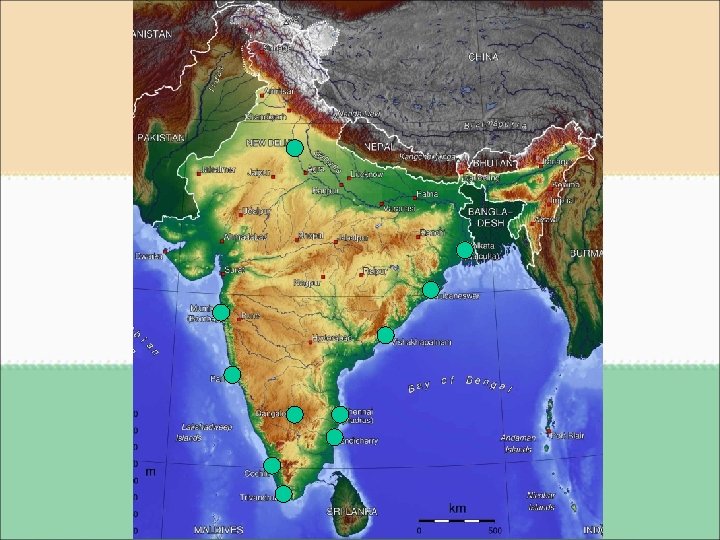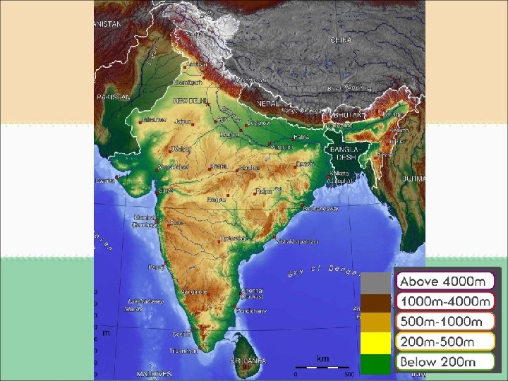 Describe the physical Geography of India 1. Using the key on the previous map (slide 11), is India generally a lowland or highland country? 2. Where are the lowland areas? 3. Where is the highest land what is it called?