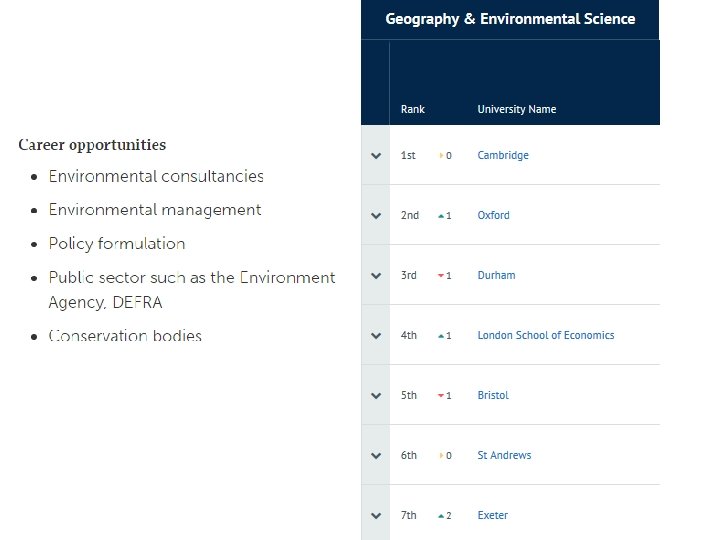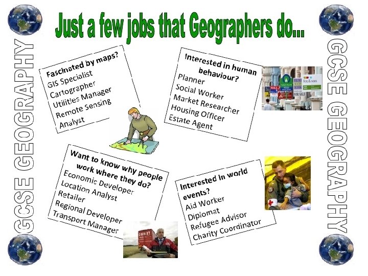 What Careers Can I do with Geography? • According to the Royal Geographical Society, Geography graduates have some of the highest rates of graduate employment. • Geography is great for any kind of career that involves the environment, planning, or collecting and interpreting data. Popular careers for people with geography qualifications include: town or transport planning, surveying, conservation, sustainability, waste and water management, environmental planning, tourism, and weather forecasting.