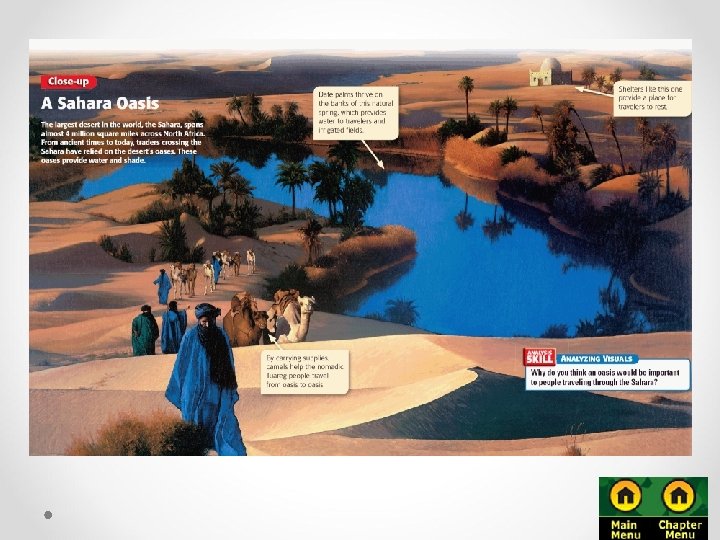The Sahara Largest hot desert in the world, covering most of North Africa Very dry, so very few people live there Nearly every settlement in the Sahara is located near an oasis, a wet and fertile area in a desert where a spring or well provides water. Common features in the Sahara include broad gravel plains, tall sand dunes, and dry streambeds.