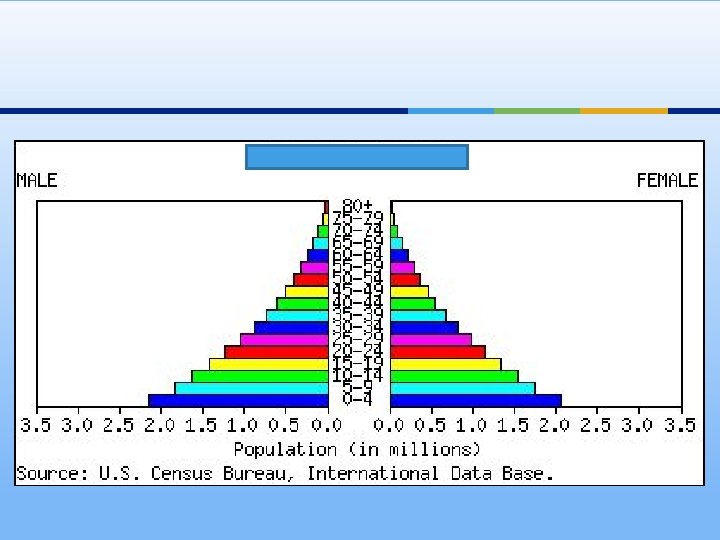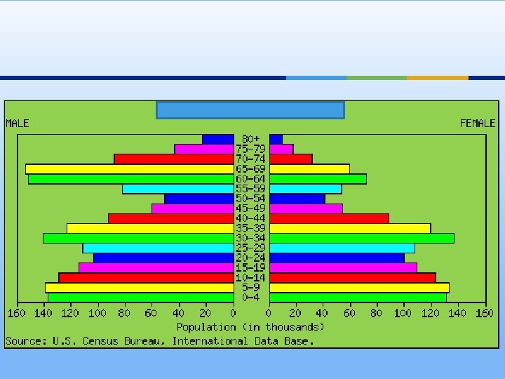 Important points to consider ¥ Taken 1. 2. from the US Census Bureau! Look beyond census numbers in order to decipher problems in data collection. This involves knowing the history of a country and examining the extent to which past events have affected the population structure. The effects of war in 1963 on males ages 20 -24, might be apparent in a 2013 population, among males ages 70 -74, for