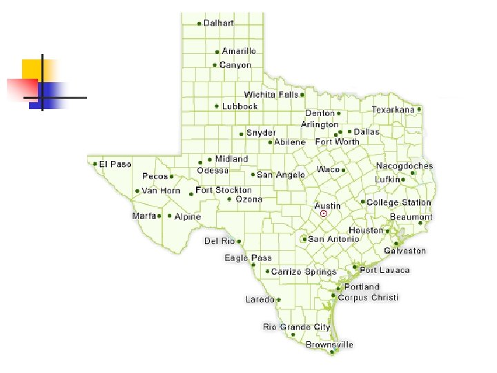 Cities n Represented by dots. Relative sizes of cities can be used by using dots of different size.