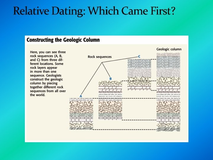 • Geologists try to determine the order in which events have happened during Earth’s history. They rely on rocks and fossils to help them in their investigation. • The process of determining whether an event or object is older or younger than other events or objects is called relative dating.