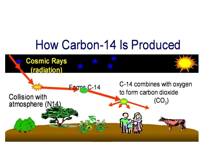 Types of Radiometric Dating, continued • Carbon-14 Method Carbon is normally found in three forms, the stable isotopes carbon-12 and carbon-13, and the radioactive isotope carbon-14. • Living plants and animals contain a constant ratio of carbon-14 to carbon-12. Once a plant or animal dies, no new carbon is taken in. The amount of carbon-14 begins to decrease as the plant or animal decays.