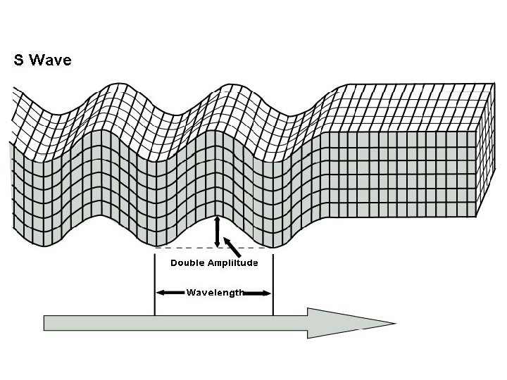 – B) S-waves/Secondary waves • slower (3 - 7 km/sec) • Are shear waves because they move perpendicular to direction of travel • Travel only through solids (not fluids)