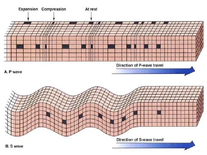 2. Body Waves – Travel inside the Earth – a) P-waves/Primary waves • Fastest (7 -13 km/sec) • A compressional/pull-push wave like sound • Travel through everything (rock, magma, water, air ( can sometimes hear EQ!)