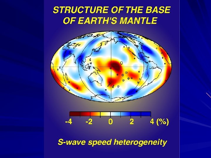 Seismic Tomography • Numerous seismic waves are analyzed to give a “CAT-scan” of the Earth • Hot and cold areas of the mantle have been detected by measuring wave velocities (hot rock is less elastic = lower velocity) • Depressions and rises have been detected where rising and sinking mantle deforms the mantle and core.