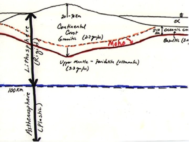 • P-waves travel faster (8 km/sec) in mantle than in crust (6. 75 km. sec) • Moho – bottom of crust – Below continents: 2 - 90 km (aver’ 35 km) – Below seafloor: 5 -10 km. Please refer to WS 10. 1, p. 2 of notehelper, bottom diagram.