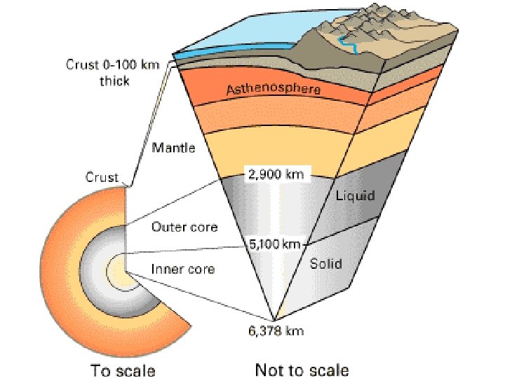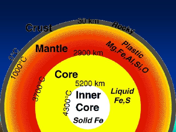 Layer Vol % Density gms/cm 3 Oceanic Crust 0. 16 3. 0 Continental Crust 0. 44 2. 7 Composition upper: basalt lower: gabbro granodiorite Mantle 83 3. 3 – 5. 7 peridotite Outer Core 15. 7 9. 9 – 12. 2 Inner Core 0. 7 12. 6 – 13. 0 80 - 90% Fe, +Ni 88%Fe, +S, O 2, Ni, K