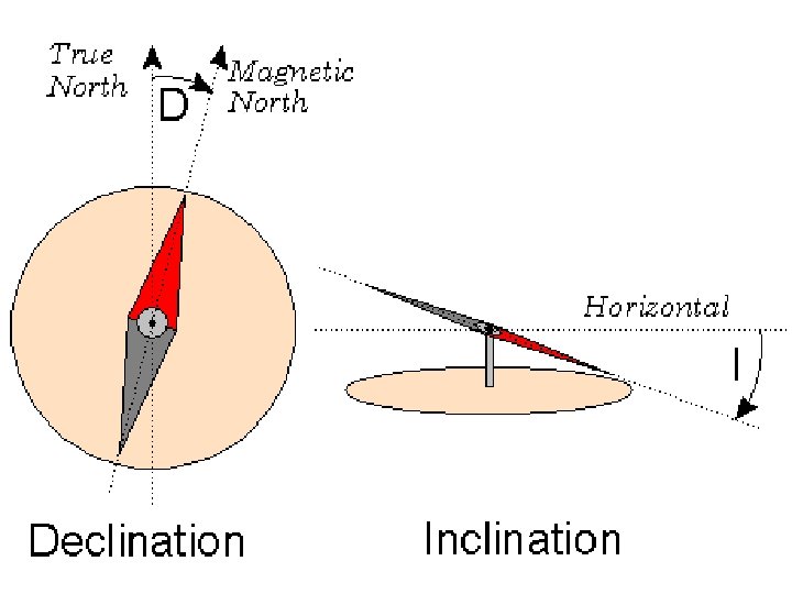 • Magnetic Inclination = deviation in magnetic field from horizontal • Compass wants to point down at north end; up at south end. True north Magnetic pole Lines of magnetic force Inclination/tilt of compass needle