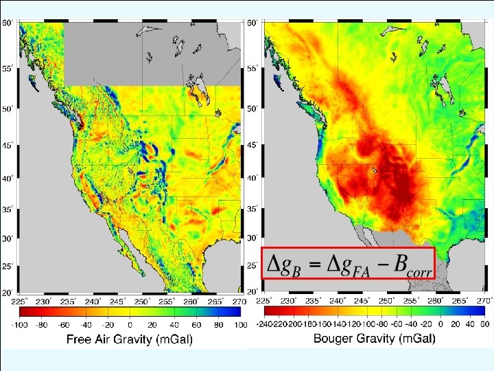 Some applications take a further step and calculate a correction for mass that isostatically compensates topography… Implicitly assumes that all loading is topographic mass “piled on” at the surface, and also assumes a lithospheric plate strength (usually local isostasy no strength) Explicitly wrong– there are better ways to address.