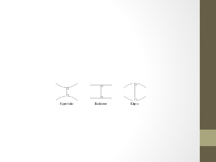 • Cuando intentaron reducirlo al absurdo negándolo, surgieron dos nuevas geometrías: la elíptica, también llamada geometría de Riemann o riemanniana (dada una recta y un punto exterior a ella, no existe ninguna recta que pase por el punto y sea paralela a la recta dada) y la hiperbólica o de Lobachevsky (existen varias rectas paralelas que pasen por un punto exterior a una dada)