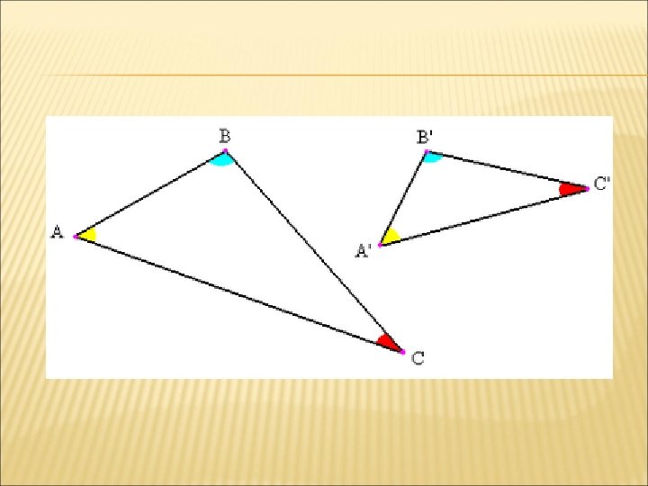 SEMEJANZA DE TRIANGULOS � Dos triángulos son semejantes si tienen la misma forma. En tal caso cumplen que: 1. Los ángulos correspondientes son iguales: � 2. Los segmentos correspondientes son proporcionales: � donde , se la razón de semejanza.