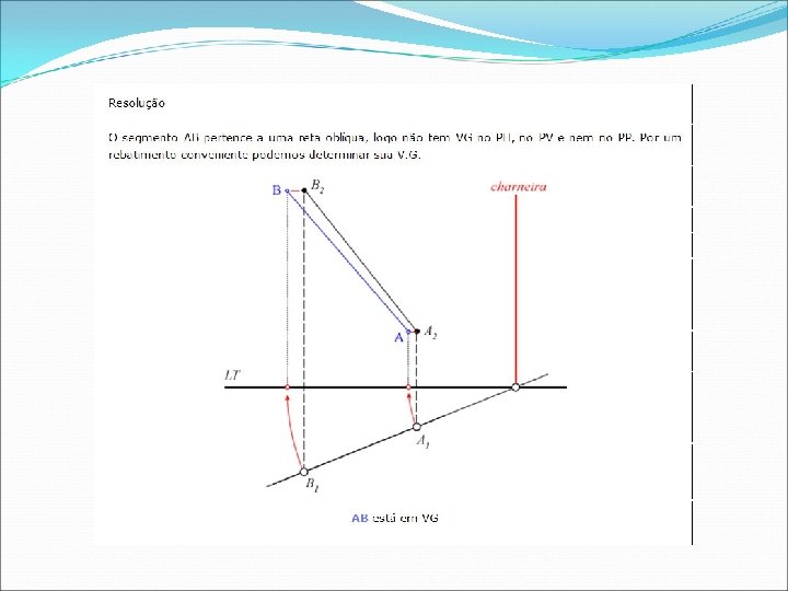 A reta que passa pelos pontos A e B é uma reta do tipo qualquer. A reta qualquer é oblíqua aos planos de projeção vertical e horizontal e na épura suas duas projeções são oblíquas à Linha de Terra.