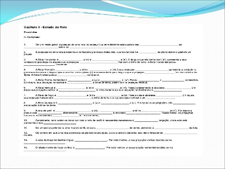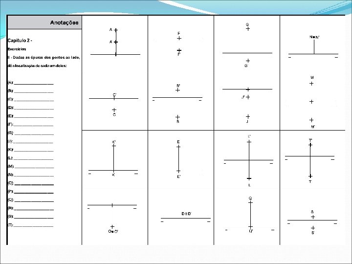 EXERCÍCIOS 1. Quais são as diferentes posições que um ponto ocupa em relação aos semiplanos horizontal e vertical? 2. Qual posição ocupa o ponto (Q) se na épura Q e Q´ estiverem do mesmo lado da Linha de Terra? 3. Sabendo que Q´ está na Linha de Terra e Q está abaixo da Linha de Terra o que podemos dizer com relação à posição de (Q)? 4. Desenhar a Épura de um Ponto L situado no primeiro Plano Bissetor. 5. Desenhar a Épura de um ponto M situado no terceiro diedro com M´=3 M.
