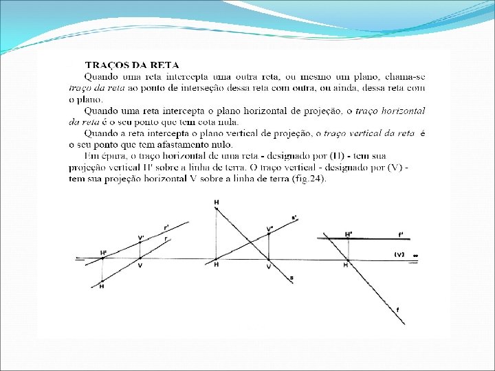 TRAÇOS DE UMA RETA Chama-se “Traço de uma reta sobre um plano” o ponto em que essa reta fura ou atravessa esse plano. O Traço sobre o Plano Vertical é o “Traço Vertical” e representa-se por (V). O Traço Vertical tem afastamento nulo. O Traço sobre o Plano Horizontal é o “Traço Horizontal” representado por (H). O Traço Horizontal tem cota nula.