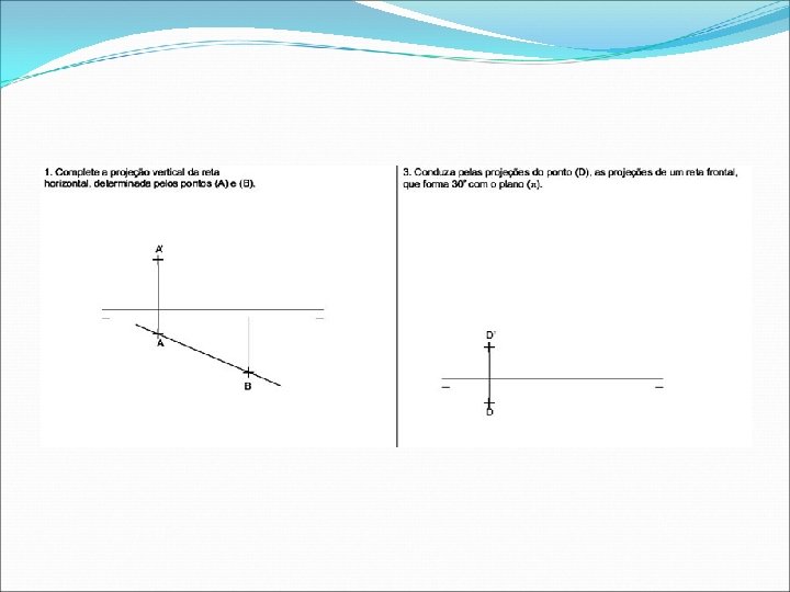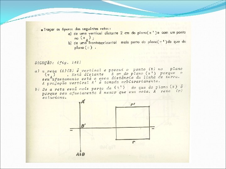148. Traçar as Épuras. de uma reta AB vertical distante 2 cm do Plano Vertical Superior e com um ponto no Plano Horizontal Anterior. . de uma reta Fronto-horizontal mais perto do Plano Vertical Superior do que do Plano Horizontal.