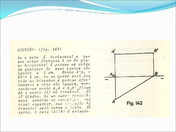 142. Traçar uma Reta Horizontal AB distante 2 cm do Plano Horizontal, contendo. o ponto A no Plano Bissetor do Primeiro Diedro e. o ponto B no Plano Vertical Superior.