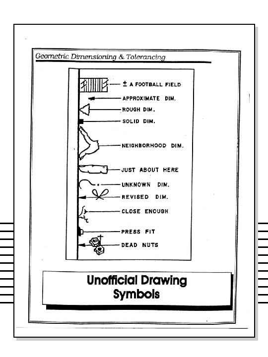 WHY IS GD&T IMPORTANT n n n Saves money – For example, if large number of parts are being made – GD&T can reduce or eliminate inspection of some features. – Provides “bonus” tolerance Ensures design, dimension, and tolerance requirements as they relate to the actual function Ensures interchangeability of mating parts at the assembly Provides uniformity It is a universal understanding of the symbols instead of words