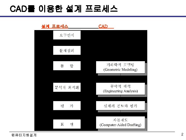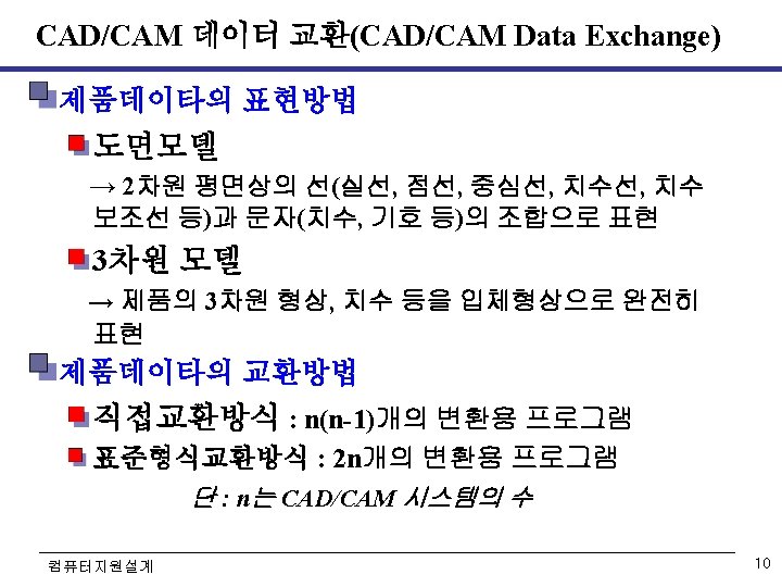형상모델링의 정의 및 접근방법 형상 모델링(Geometric modeling) – a major task of CAD, constructing geometric patterns of parts/products on the display (pattern design) 형상 모델링의 접근방법 와이어프레임 모델링 (wireframe 곡면 모델링 솔리드 모델링 (surface modeling) (solid modeling) 컴퓨터지원설계 3