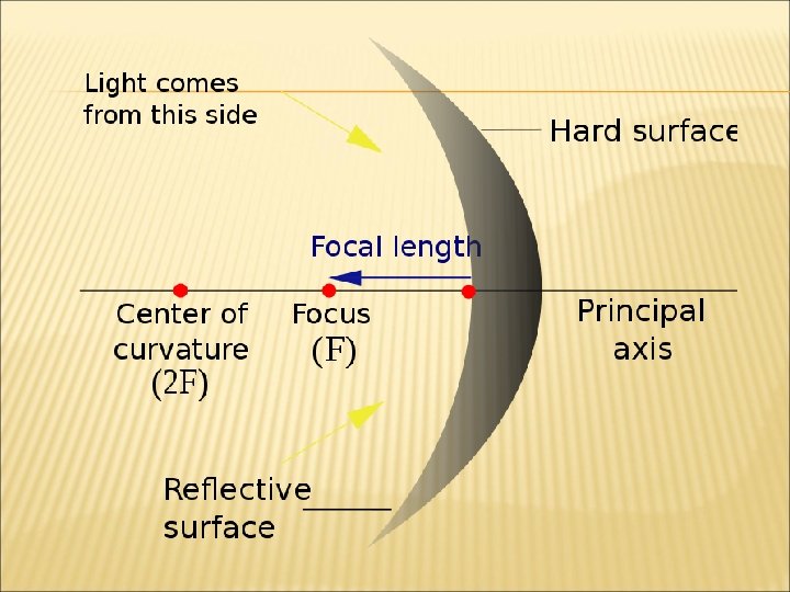 PARTS OF A MIRROR RAY DIAGRAM Principle axis: The straight line perpendicular to the curved surface at its center. Focal point: The point where rays parallel to the principle axis come to a focus. Image Focal location of an object infinitely far away. length: the distance from the focal point to the mirror. Radius of curvature: the center of the sphere the mirror is made from