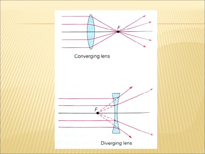 TYPES OF LENSES Converging lens: a lens that is thicker in the center than at the edges makes parallel rays converge to a point. Diverging lens: a lens that is thinner in the center than at the edges makes parallel rays diverge. The focal point is defined as the point from which refracted rays seem to have emerged from as a single point.