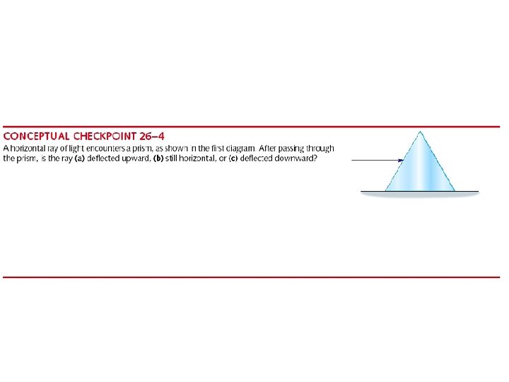 Example: air-water interface If you shine a light at an incident angle of 40 o onto the surface of a pool 2 m deep, where does the beam hit the bottom? Air: n=1. 00 40 air water 2 m d Water: n=1. 33 (1. 00) sin(40) = (1. 33) sin Sin = sin(40)/1. 33 so = 28. 9 o Then d/2 = tan(28. 9 o) which gives d=1. 1 m. Turn this around: if you shine a light from the bottom at this position it will look like it’s coming from further right.
