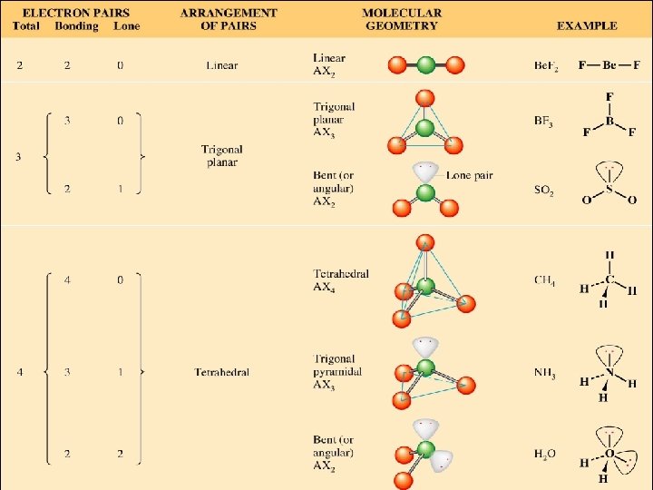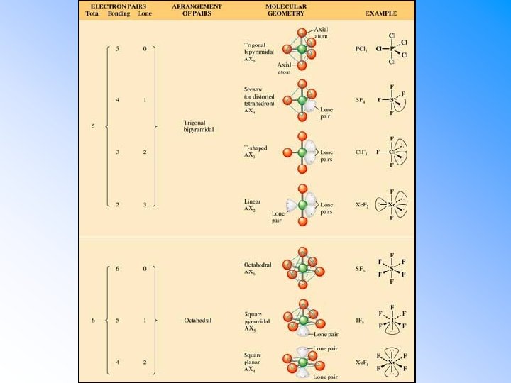 VSEPR: predikce molekulární geometrie • Z Lewisova vzorce plyne počet vazeb a nevazebných el. párů kolem centrálního atomu - sterické číslo, které určuje základní molekulární geometrii. • Volné elektronové páry a násobné vazby ovlivňují geometrii více než jednoduché vazby. Ze základních tvarů pak vznikají tvary odvozené. • Př. : NH 3 má jeden volný elektronový pár. Vazebný úhel mezi atomy H je redukován z hodnoty 109° (úhel v základním tetraedrickém tvaru) na 107°. V molekule H 2 O se dvěma volnými elektronovými páry svírají atomy H úhel pouze 105°. • Podobný efekt mají násobné vazby: H 2 C=O (116° místo 120° mezi atomy H); H 2 C=CH 2 (117° místo 120° mezi atomy H). • Př. : Navrhněte geometrii následujících molekul: – Be. Cl 2, CO 2 - BF 3, COCl 2, O 3, SO 2 – CH 4, PCl 3, H 2 O - PCl 5, SF 4, Cl. F 3 – SF 6, IF 5, Xe. F 4