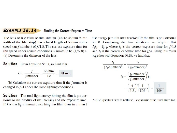 • Daha ayrıntılı fotoğraf makinelerinde filme ulaşan ışık şiddetini daha fazla kontrol etmek için çapı ayarlanabilir açıklıklara sahiptirler. Daha küçük çaplı bir delik kullanıldığında, sadece merceğin merkezi kesiminden gelen ışık filme ulaşı; küresel hata bu şekilde azaltılır. • Filme ulaşan ışığın şiddeti I, merceğin alanı ile orantılıdır. Bu alan D mercek çapının karesiyle orantılı olduğu için şiddet ile mercek çapı arasında • Işık şiddeti görüntünün birim alnı başına film tarafından enerjinin alınma hızının bir ölçüsüdür. Görüntü alanı q^2 ile orantılıdır ve q, f odak uzaklığına eşit kabul edildiğinde (p>>f için). Bu durumda ışık şiddeti ile odak uzaklığı arasında İlişkisi vardır.