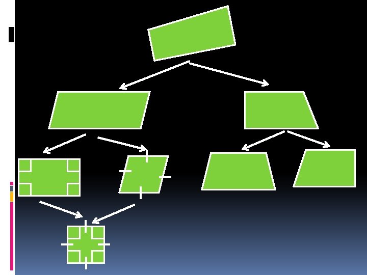 QUADRILATERAL – a polygon with four sides, four angles and four vertices PARALLELOGRAM – a quadrilateral that has two pairs of opposite sides that are parallel RECTANGLE – a parallelogram that has four right angles RHOMBUS – a parallelogram that has four equal sides SQUARE – a rectangle that has four equal sides – a rhombus that has four right angles