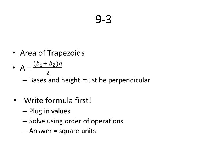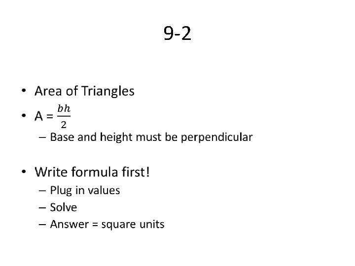 9 -1 • Area of Parallelograms • A = bh – Base and height must be perpendicular • Write formula first! – Plug in values – Solve – Answer = square units
