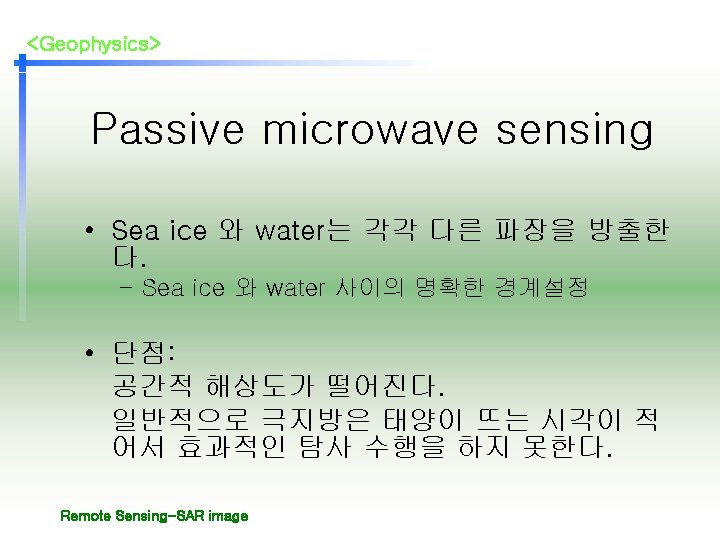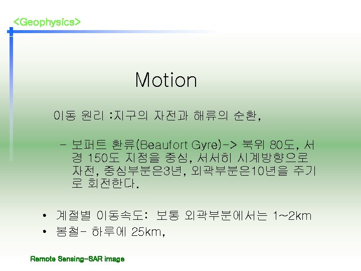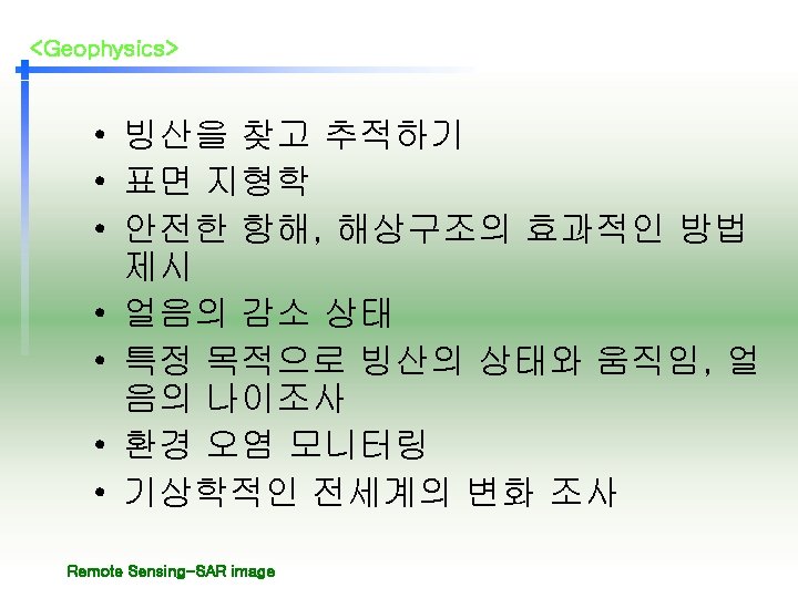 Geophysics 1 Sea Ice Remote SensingSAR image Geophysics Slides: 24 Download presentation <Geophysics> 1. 서론 Sea Ice (해빙) 해수가 얼어서 생긴 얼음 Remote Sensing-SAR image <Geophysics> 해빙의 분포 • 북아메리카 2천 5백만㎢ 의 면적 Remote Sensing-SAR image <Geophysics> 육상 정착빙(land fast ice) NASA의 Kid Sat image Remote Sensing-SAR image <Geophysics> 빙맥(Ice Ridge) Remote Sensing-SAR image <Geophysics> 2. 본론 Examples of sea ice information -ice type / age / motion -ice concentration Remote Sensing-SAR image <Geophysics> New Ice • New Ice: 최근에 형성 된 얼음. – Frazil ice – Grease ice – Slush – Shuga Remote Sensing-SAR image <Geophysics> First & Multi-year Ice Remote Sensing-SAR image <Geophysics> Ice concentration • 기존의 연구자료를 바탕으로 얼음의 분 포 상태와 집적도를 조사 In the Woods' Island area, very close pack grey and nilas Remote Sensing-SAR image <Geophysics> The type of remote sensing • Active Radar • Passive Microwave sensor Remote Sensing-SAR image <Geophysics> Active radar • 표면과 내부의 특징을 모두 조사 가능. • backscattering – Surface factor : » roughness » snow cover » Internal geometry / microstructure – 얼음의 비전도성: salinity, temperature Remote Sensing-SAR image <Geophysics> Surface texture • New ice: dark • First-year ice: 다양한 밝기 • Multi-year ice: Bright Remote Sensing-SAR image <Geophysics> Canada’s banks island Remote Sensing-SAR image <Geophysics> Sea Sat image • Canada banks island 의 남부해 안을 따라 찍은 image • 2004년 6월 1일 pm 18: 00 Remote Sensing-SAR image <Geophysics> Image analysis chart Remote Sensing-SAR image <Geophysics> Egg Chart Remote Sensing-SAR image