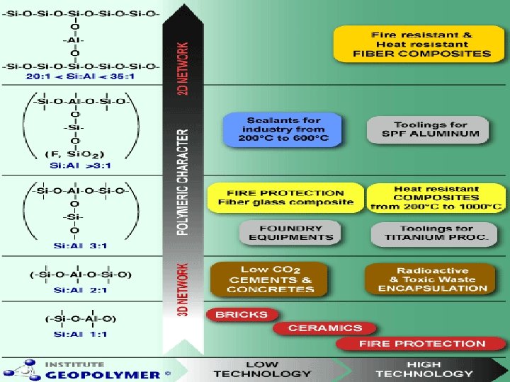 PROPERTIES OF GEOPOLYMERS Physical properties • • • high strength resistance against acids temperature resistance cold setting quick setting Environmental properties • • use of secondary raw materials extended lifetime minimum CO 2 production solidification of toxic and nuclear wastes
