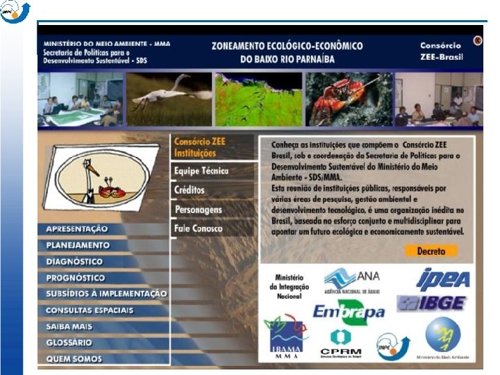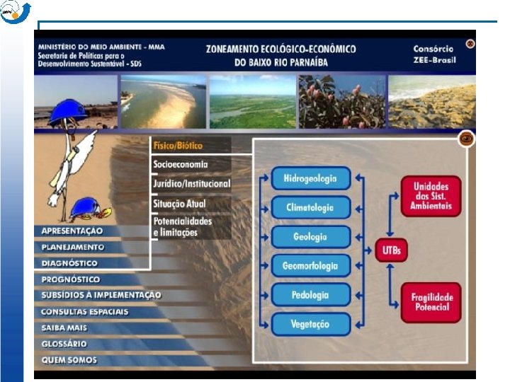 Geoprocessamento e Políticas Públicas: Ordenamento Territorial n Objetivo Estabelecer diretrizes para ocupação e uso do território ¨ Dar suporte a aplicação de legislação (e. g. , Código Florestal) ¨ n Organização ¨ Consórcio ZEE Brasil n ¨ Resultados obtidos no período 2000 -2003 n n n MMA, IBGE, CPRM, IBAMA, INPE, EMBRAPA Zoneamento do Delta do Parnaíba (PI) Banco de Dados Macro-Regional da Amazônia Contribuição do INPE ¨ Implementação da metodologia ZEE no ambiente SPRING