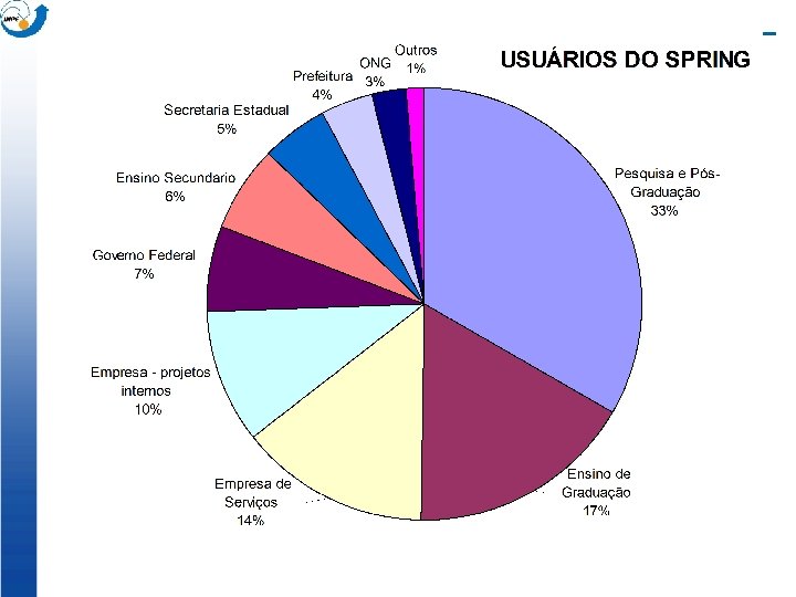 Estratégia de Ocupação de Mercado n Estabelecer acordos de complementaridade para desenvolvimento e uso de metodologias ¨ n EMBRAPA, PETROBRÁS, FIOCRUZ, MMA, IBAMA Política de capacitação de recursos humanos em universidades e institutos de pesquisa SPRING e Terra. Lib como instrumentos de aprendizado ¨ Cursos, livros, programas de pós-graduação e especialização ¨ n Apoio à criação de empresas com suporte técnico ¨ n IMAGEM, Geo. Ambiente, GISPLAN Liderança científica no País Cooperação internacional: Univ. Maine (NCGIA), Univ. Viena, Univ. Londres, Univ. Califórnia (Sta Barbara) ¨ Publicações científicas, doutorados e mestrados ¨
