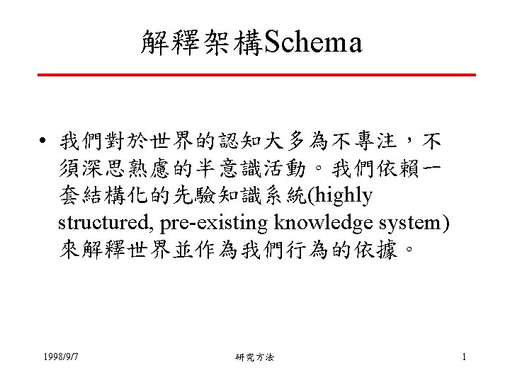Overview of the scientific method o Assessment of relevant existing knowledge o Formulation of concepts and propositions o Statement of hypotheses o Design the research to test the hypotheses o Acquisition of meaningful empirical data o Analysis and evaluation of data o Provide explanation and state new problems raised by the research 1998/9/7 研究方法 39