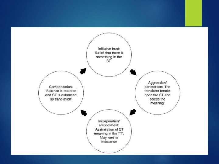 CONCLUSION "This view of translation as a hermeneutic of trust (élancement), of penetration, of embodiment, and of restitution, will allow us to overcome the sterile triadic model which has dominated the history and theory of the subject. " (Steiner 160) Steiner criticizes the triadic model for: Having no precision or philosophical basis. Overlooking the key fact that a fourfold discourse is conceptually and practically inherent in even the rudiments of translation.