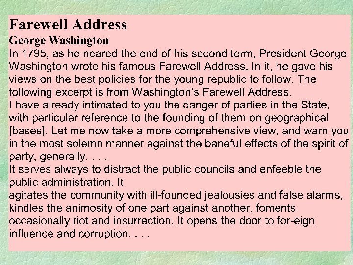 Washington’s Farewell Address § (2) Urged Americans to stay away from political parties l Washington said political parties would weaken the unity of Americans