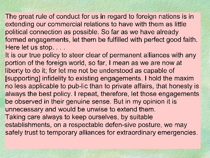 Washington’s Farewell Address § (3) Advised the country to stay neutral l l Warned against making long- term agreements with foreign nations Lead to isolationism until the end of the 1800 s
