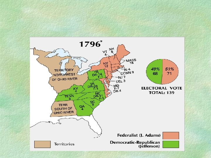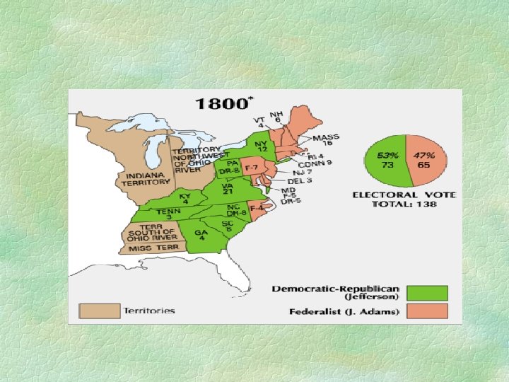 XYZ Affair, continued § X, Y, Z want bribes to allow Americans to talk to French Foreign Minister § John Marshall leaves France § Naval war lasts from 1798 – 1800 § Convention of 1800 signed in Paris