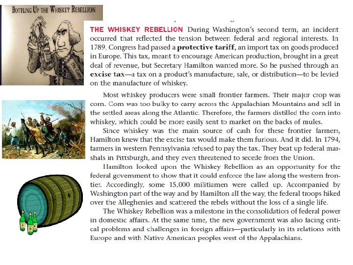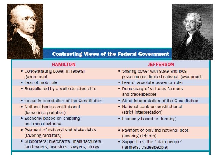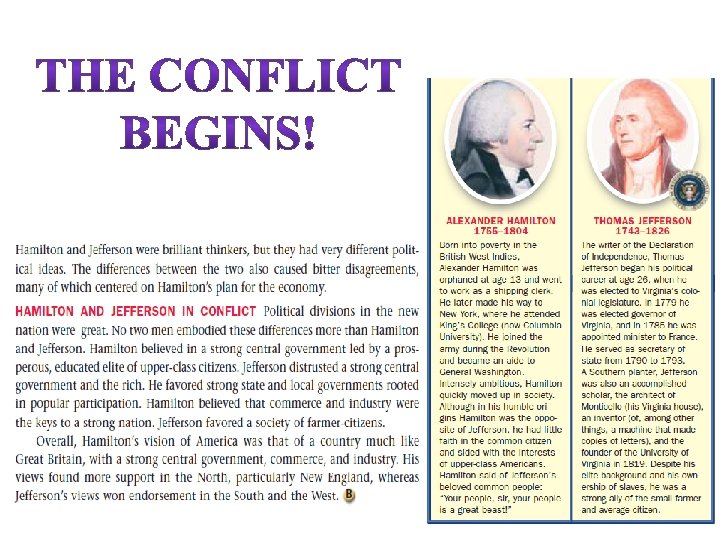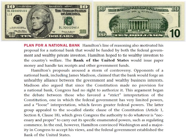 Hamilton’s Economic Plan The Problems • As the Secretary of the Treasury, Hamilton believed he should bring “order” to our nation’s finances. • The Federal Government owed money both home and abroad. • Some states still owed debts from the Revolutionary War • Soldiers had been issued government bonds which needed to be repaid • We needed to repay foreign debts as soon as possible to secure a good credit rating in the world! The Solutions • • • Hamilton issued a report on the nation’s finances to the President and Congress Pay off foreign debt first – and issue new bonds to cover the old ones. He wanted to take over all state debts from the Revolutionary War, as all America had benefitted and we needed good credit with foreign nations. Proposed to sell bonds as a way to get wealthy individuals invested in the success of the government AND to repay foreign debts with cash at face value. Create a National Bank to help manage the nation’s finances.