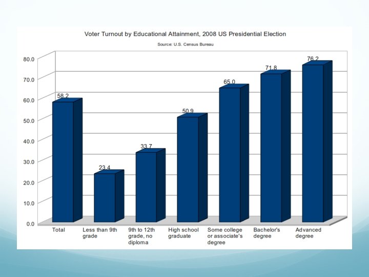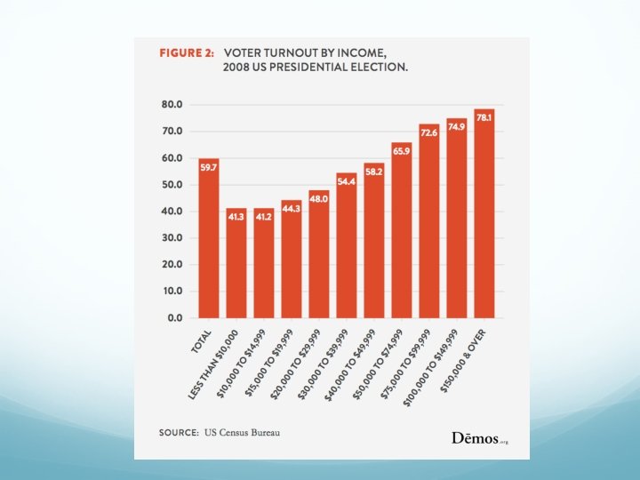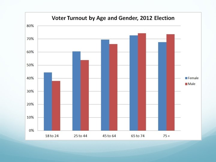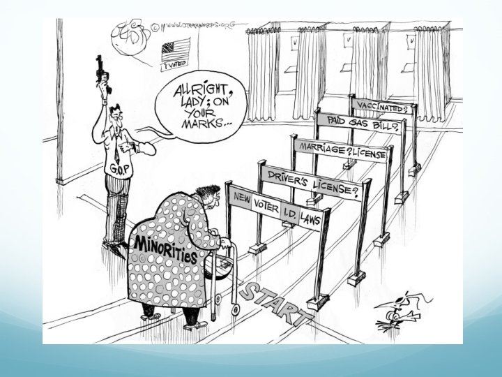 Obstacles/Reflection of the population Voter Registration ● Absentee Ballots ● Single Day, Tuesday Voting ● Voter ID Laws Demographic Groups ● Young (18 -21) ● Low income ● Language Barriers ● Felony Record ● ● ● Apathy Transient People (on the move)
